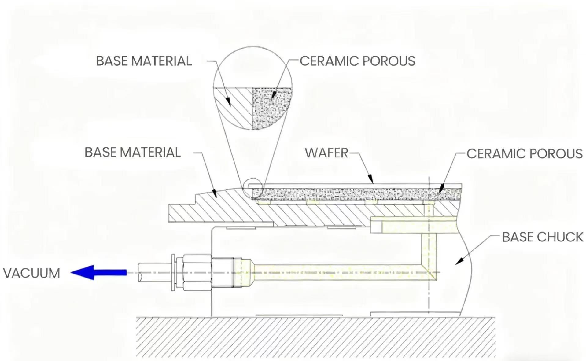 Aangepastporeuze keramische boorkopbestaat uit de basis en de poreuze keramische plaat. Aansluitend op een vacuümsysteem wordt de lagedrukomgeving gecreëerd door de lucht tussen de wafer en het keramiek te evacueren. Onder vacuüm-negatieve druk wordt de wafer stevig aan het spanoppervlak gehecht, waardoor uiteindelijk een veilige en stabiele fixatie en positionering wordt bereikt.