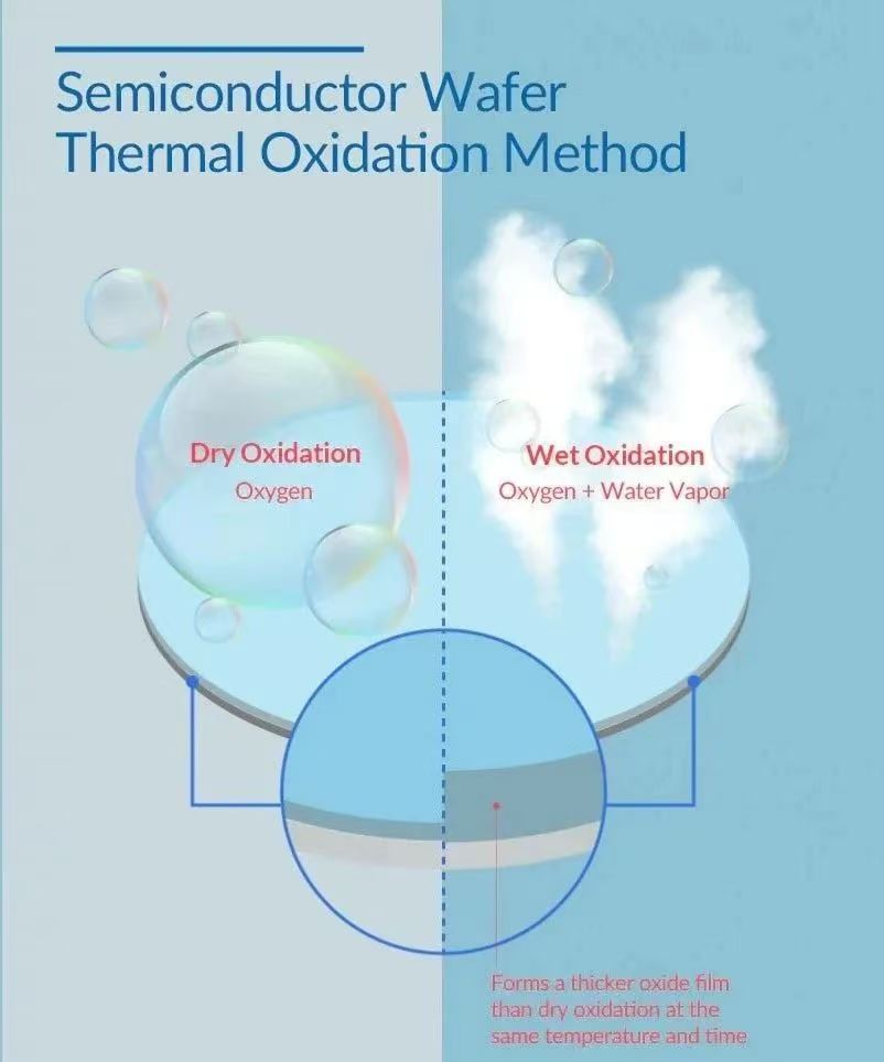 Natte oxidatie werkt door siliciumwafels bloot te stellen aan waterdamp van hoge temperatuur, die een chemische reactie tussen silicium en de damp teweegbrengt om siliciumdioxide (SiO₂) te vormen. Dit proces produceert oxidelagen met een lage uniformiteit en dichtheid en produceert ongewenste bijproducten zoals H2, die doorgaans niet worden gebruikt in het kernproces. Dit komt omdat de groeisnelheid van de oxidefilm sneller is omdat de reactiviteit van waterdamp hoger is dan die van pure zuurstof. Daarom wordt natte oxidatie meestal niet gebruikt in de kernprocessen van de halfgeleiderproductie.
