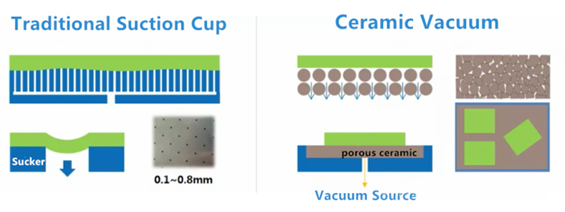 Traditionele metalen klauwplaten hebben een ongelijkmatige zuigkracht, zijn gevoelig voor vervorming op dunne materialen, hebben geen antistatische eigenschappen en zijn gevoelig voor slijtage vanwege hun lage hardheid. Keramische vacuümklauwplaten zijn daarentegen geschikt voor dunne onderdelen, bieden antistatische eigenschappen en zijn slijtvast en corrosiebestendig.