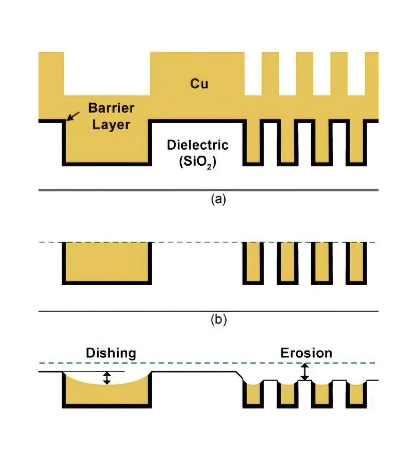 Dishing betekent het overmatig polijsten van zachtere materialen (zoals koper) tijdens het CMP-proces, wat resulteert in plaatselijke schijfvormige centrale depressies. Dit fenomeen komt vaak voor bij brede metaallijnen of grote metalen oppervlakken en komt voornamelijk voort uit inconsistenties in de hardheid van het materiaal en een ongelijkmatige mechanische drukverdeling. Dishing wordt voornamelijk gekenmerkt door een verdieping in het midden van een enkele, brede metalen lijn, waarbij de diepte van de verdieping doorgaans toeneemt met de lijnbreedte.