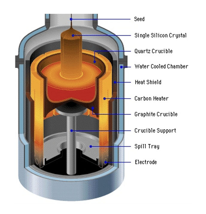 Wafeltjesworden gesneden uit kristalstaven, die zijn geproduceerd uit polykristallijne en pure, ongedoteerde intrinsieke materialen. Het proces waarbij polykristallijn materiaal door smelten en herkristallisatie in enkele kristallen wordt omgezet, staat bekend als kristalgroei. Momenteel worden voor dit proces twee hoofdmethoden gebruikt: de Czochralski-methode en de zone-smeltmethode. Hiervan is de Czochralski-methode (vaak de CZ-methode genoemd) de belangrijkste voor het kweken van enkele kristallen uit smeltingen. In feite wordt meer dan 85% van het monokristallijne silicium geproduceerd met behulp van de Czochralski-methode.
